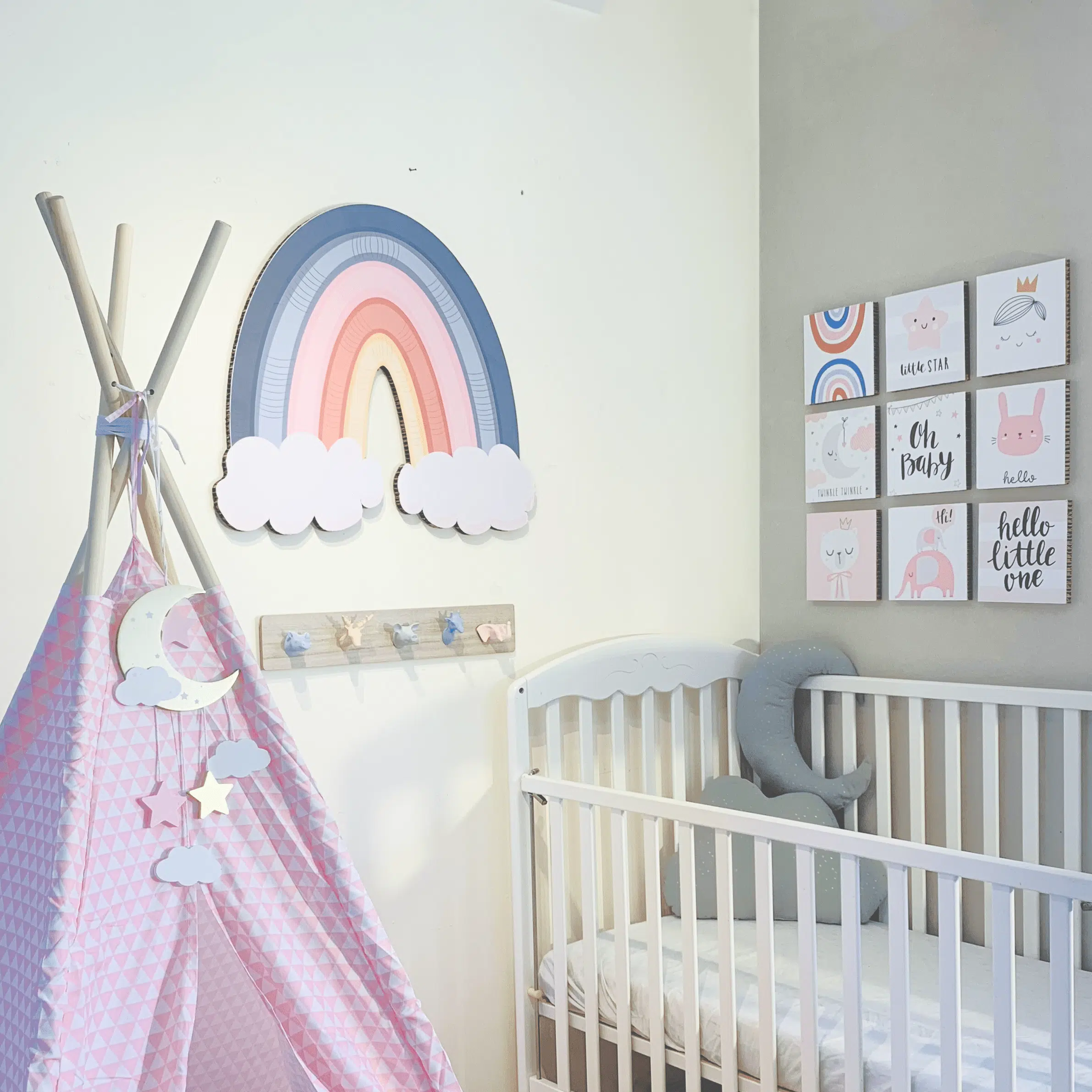 קיט קשת לחדר הגיל הרך , בעיצוב מושיק גלאמין יהפוך את חדר התינוק שלכם לצבעוני ושמח הוא מכיל אוהל טיפי ורוד שישמש אותו למשחק והנאה, מובייל ירח ענן וכוכבים לתליה, מתלה ראשי חיות צבעוני ,כריות נוי ירח וענן ולהשלמת מראה הקיר –וופלס קשת בענן צבעונית גדולה וקלילה ו9 יחידות וופלס, מוצר חדש מבית אינסטבלוק,קל,ידידותי לסביבה, לתליה קלה, מודפסים באיורים עדינים ותואמים.